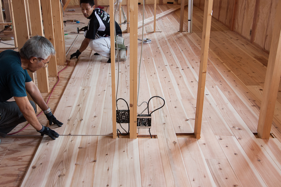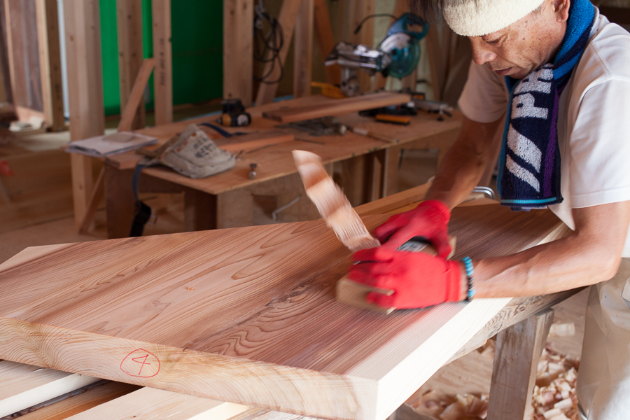 ホーム > 新築工事 / 長期優良住宅 A様邸新築工事 内部の仕上工事が着々と進んでおります★ ↓巨大な一枚板から・・・ ↓木目や節の状況を考慮しながら板を切り出していきます。 ↓これは階段の部材です。 丁寧にカンナをかけて仕上げていきます。 ↓こちらは杉の無垢フローリングの施工中です。 無垢材のフローリングは浸透性のオイルで保護塗装してやると肌触りがサラリと仕上がりとても良いです。 共有:TwitterFacebookいいね:いいね 読み込み中… カテゴリー:新築工事長期優良住宅 Norikazu 関連投稿 新築工事 / 長期優良住宅 基礎配筋検査 新築工事 リノベーション 新築工事 基礎断熱&土台敷き 新築工事 外壁の左官仕上 長期優良住宅 認定長期優良住宅 コメントを残す コメントをキャンセルメールアドレスが公開されることはありません。 * が付いている欄は必須項目ですコメント 名前 * メール * サイト 次回のコメントで使用するためブラウザーに自分の名前、メールアドレス、サイトを保存する。 コメントするΔ 前の投稿 耐震診断 次の投稿 お化粧直し