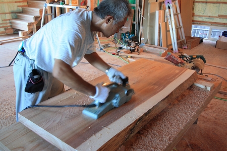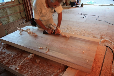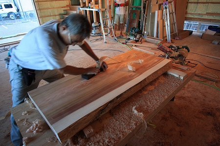 ホーム > 新築工事 リノベーション 階段の完成まであと少しです。材料には杉の集成材を利用し木の温かみを感じられる階段にしております 途中には2箇所の踊り場をもうけ万が一足を踏みはずされた時でも下まで落ちてしまわない様な安全な階段としております 隣では秋田杉の一枚もの加工していっています。無垢材の為反りが出て両端で1cm程の差がありました まずは電動カンナで削っていきます。写真ではわからないですがものすごい勢いでオガクズが排出されていっております 仕上げはもちろん熟練の技です 向こうが透けるぐらいのきれいな削りカスがどんどん出来ていっています どこに利用されるかは後日紹介しますので楽しみにしておいてください 共有:TwitterFacebookいいね:いいね 読み込み中… カテゴリー:新築工事 Fujiyasu 関連投稿 新築工事 新築現場 新築工事 フローリング修繕 新築工事 仮設足場工事完了いよいよ棟上... 新築工事 外壁の左官仕上 新築工事 / 長期優良住宅 / 麓のアソブイエ / ゼロエネ住宅 / オープンハウス ゼロエネ住宅 オープンハウス コメントを残す コメントをキャンセルメールアドレスが公開されることはありません。 * が付いている欄は必須項目ですコメント 名前 * メール * サイト 次回のコメントで使用するためブラウザーに自分の名前、メールアドレス、サイトを保存する。 コメントするΔ 前の投稿 新築現場 次の投稿 ギルドラス搬入!
